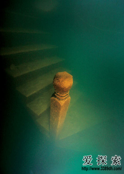 浙北徽式民居多为两层建筑,楼梯是必不可少的。在一座已经破损的民宅内,摄影师还发现了一处很特别的拐角楼梯,有别于之前在水下见到的直上直下的楼梯。李家凡说:“我推测,这家人肯定是一个大户人家,这么洋气的楼梯即便在现在陆地上的那些老宅子里也很少见。”