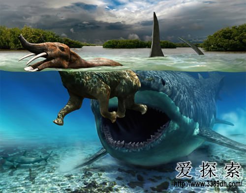 史前庞大的巨齿鲨和一只中等体型的铲齿象