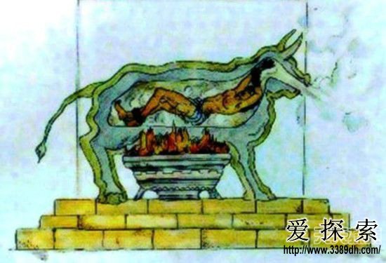 这种刑罚又称西西里牛,是一种发明于古希腊的刑罚。铜牛身上有一个可以打开的门,里面是中空的。犯人被关进“牛肚”里之后,在牛的下方点火,直至铜牛烧红使犯人慢慢被烤死。铜牛设计用于放大犯人的哀嚎声,让那些凄厉的叫声听起来像是牛的吼叫声。