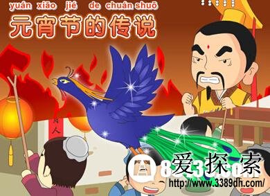 有一个传说是这样的,在古代,有一位神界天鹅闯入人间被猎手误杀。天界最高的神玉皇大帝因此发誓为这只天鹅报仇。他开始制定计划,派出一支天兵天将于农历正月十五来到人间,命令他们火烧所有的人和动物。但是其他神仙并不赞同这一计划,他们冒着生命危险提醒人间的人们。结果,在正月十五这一天前后,每一个家庭在门外挂起灯笼,并燃放烟花爆竹,给天兵天将造成各家各户起火的假象。通过这种方式,人们成功骗过了玉皇大帝,人类也因此逃过灭绝的危险。
