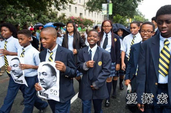 8月28日,美国华盛顿,当地学生正在参加“为了工作和公平”大游行。此次游行旨在纪念马丁·路德·金1963年领导的“向华盛顿进军”50周年。在“向华盛顿进军”行动期间,20多万民权倡导者举行集会,马丁·路德·金当天发表了着名演讲《我有一个梦想》。