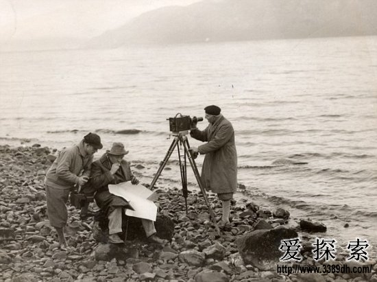 马尔马杜克-韦特雷尔(坐着的人)在寻找尼斯湖怪时研究图表