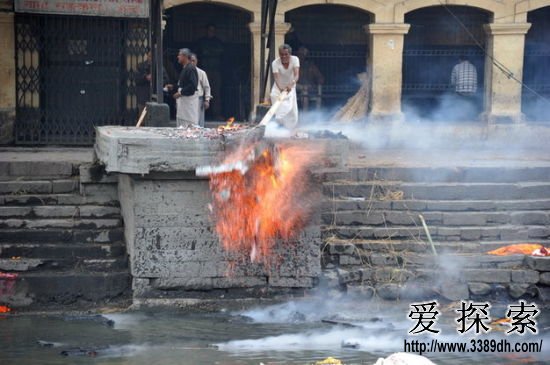 火葬前先由家属把尸体抬到河边,然后用圣水为死者净身洗脚,使死者干净地踏上来生之路,沐浴完了之后再抬到火葬台边上。在火葬台上先用300公斤木材垒5层高,然后把死者放在木材的上面。最后再覆盖一层稻草,点燃火化,家属坐在一边看着尸体被大火吞噬,在这悲惨的时刻,你却听不到家属声嘶力竭的哭声。