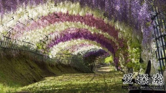 鲜艳繁盛的紫藤花盛开在日本北九州的河内藤园。樱花季节过后,随之到来的是紫藤花,其枝蔓如同葡萄藤。每年的紫藤节日,东京、静冈和冈崎都会隆重庆祝。足利花卉公园是欣赏各种不同品种紫藤花的最佳场所。
