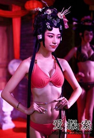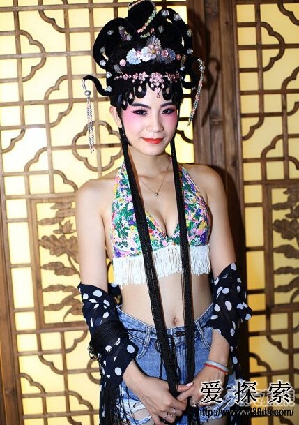 (上图)模特们,头部是传统的戏曲扮相,身上穿的却是开放的比基尼