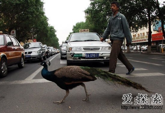 北京南锣鼓巷,一只大白鹅在悠闲地散步,吸引着路过汽车中的人。
