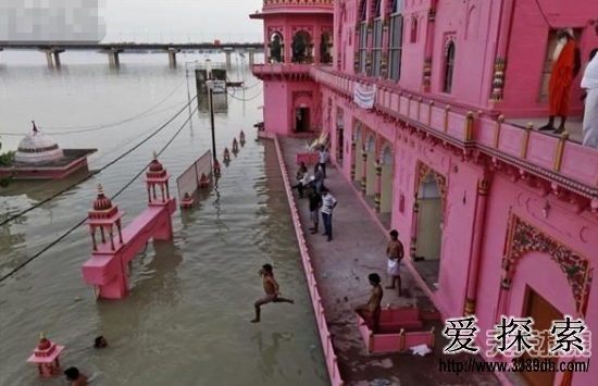 印度阿拉哈巴德,一名男子从部分被洪水淹没的居民楼上跳进恒河里解暑。