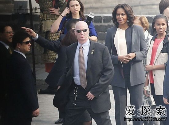 2014年3月24日,米歇尔在西安南门城墙上听讲解时,一名保镖护在她前面。有人说保镖从事的是“抓住子弹的职业”,尽管高薪高位,但风光背后的他们要比常人付出更多,甚至可能付出生命。据悉,保护米歇尔出访的这些黑衣保镖隶属美国国土安全部的特勤局。奥巴马的安保代号叫“叛逆者”,一般总统上厕所,贴身保镖也会紧随其后。如果总统在白宫以外的任何地方喝了水,贴身保镖必须将水杯带回办公地点处理掉。