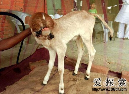 据英国媒体报道,印度北部城市纳尔瑙尔日前惊现一头罕见怪牛,生有5张嘴10片嘴唇。当它想要吃奶时,5张嘴会全部张开,但实际上只有2张嘴可以吸奶。