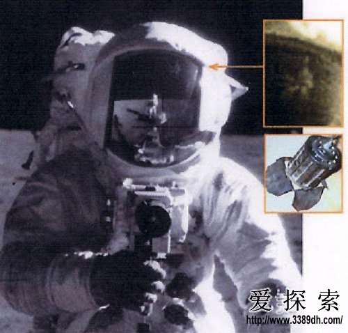 登月照片公布后,理论家们很快就注意到一个神秘的东西(如上图所示)——在阿波罗12号任务中宇航员头盔上的反射。这似乎是完全没理由出现在那的一根挂着的绳子或者电线,让很多人认为这是一个在电影棚中经常见到的聚光灯。因为图像质量太差,这一猜测仍存在疑问,但谜团依然存在:为什么会有东西悬浮在月球的半空中(几乎没有空气)。从登月舱的其他照片中似乎都没有东西从它上面伸展出来,所以这至今仍完全无法解释。