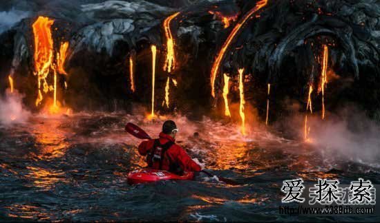 图为皮划艇爱好者Pedro Oliva在基拉韦厄火山倾盆而下的炽热熔岩旁划船,甚至徒步爬上海岸边的岩石焚烧船桨。Pedro戴着白色太阳眼镜避免熔岩眩光对眼睛的伤害,他“悠然自得”的划着船,对着相机摆姿势,甚至还有空喝饮料,这样的勇气着实让人佩服。