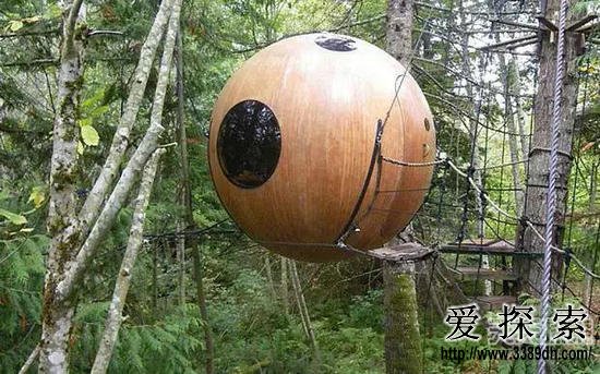手工制造的酒店位于温哥华岛西海岸雨林中,它的外形看上去像一个不明飞行物。球状客房被绳子固定在周围的树干上,随着微风轻轻摇曳。