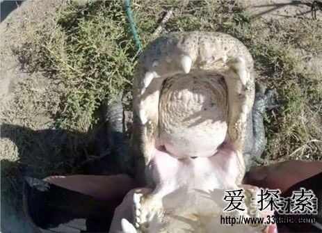 然后用下巴顶着这条巨鳄张开的大嘴