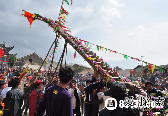 接着,闯火者以闪电般的速度,个个手棒通红的火炭,分别在脸上和身上擦洗,然后又让火球在他们手中飞炔地翻滚、搓揉。围观的群众时而欢快,时而紧张,时而赞叹,时而惊讶…迸进发出阵阵喝彩声。经过一阵紧张激烈的表演雌堆火炭被踩成碎粒,火焰已奄奄一息时,"跳火海"活动方告结束。第二天,刀杆场上竖起两根二十余米高的红花树杆,树间交叉着三十六把刀刃朝上的长刀。晌午时刻,欢乐的人群再次挤满广场。随着主持者一声令下,锣鼓喧天,鞭炮齐鸣,昨晚"跳火海"的五名雾大头戴蓝布帽,身装大、红袍,赤脚冲至刀杆树下,各自斟满一杯壮胆酒一饮而尽。随即纵身跳上刀杆,双手紧抓上层的刀面,赤脚斜踩于下层锋利的刀刃上,运用平时练就的气功本领撑着脚掌,手脚交替,一步一步地向上攀登。当勇士们登上高高的杆顶时,场上簇拥的观众,个个瞠目结舌,并爆发出热烈的欢呼声。