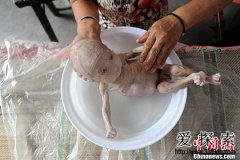 郭恩泽的身体由于营养不良,开始萎缩。马俊明 摄 郭恩泽的大姑在为他洗澡。马俊明 摄 出生89天的无肛婴儿郭...