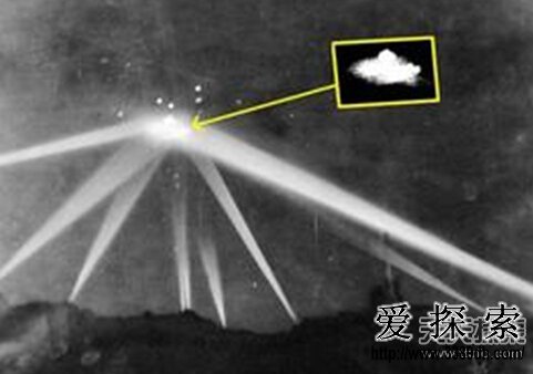 探照灯在天空在洛杉矶不明物体收敛。在清晨的空袭警报,1400多名高射炮弹的发射。