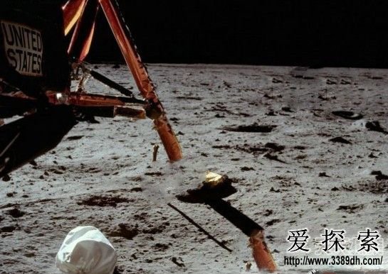 读者注意看照片的上部,有清晰的脚印,而且脚印还明显有深度,就说明这块不是坚硬无比的石头,是有月尘的,各位再看支撑腿前面伸出的一个圆柱体的东西,看着像一颗雪茄烟,它的中部也是被埋在月尘里的,结果,偏偏这支撑腿却是一点月尘都没有溅起来!